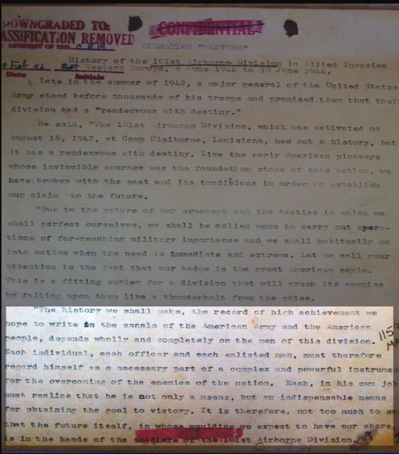 The history we shall make, the record of high achievement we hope to write in the annals of the American Army and the American people, depends wholly and completely on the men of this division. Each individual, each officer and each enlisted man, must therefore regard himself necessary part of a complex and powerful instrument for the overcoming of the enemies of the nation. Each, in his own job, must realize that he is not only a means, but an indispensable means for obtaining the goal to victory. It is therefore, not too much to say that the future itself, in whose moulding we expect to have our share, is in the hands of the soldiers of the 101st Airborne Division.