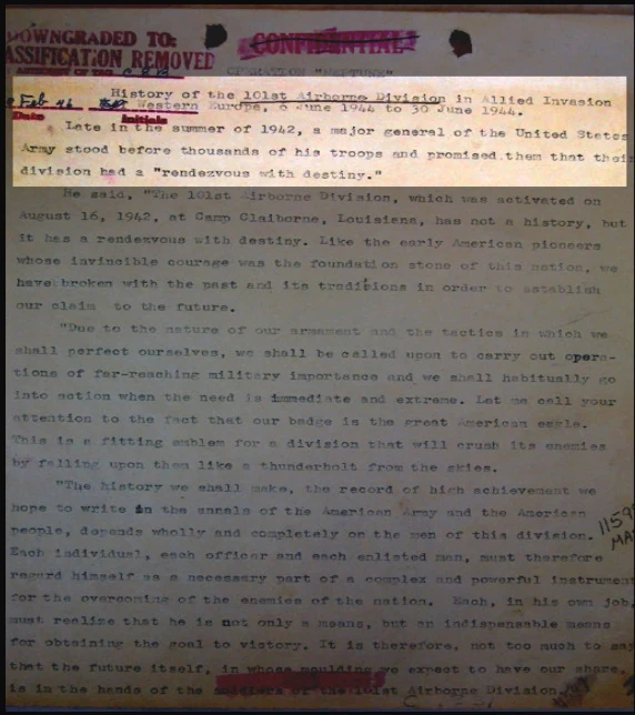 Page 1 of "The History of the 101st Airborne" from the official US Army reports preserved at the US National Archives in Washington DC.