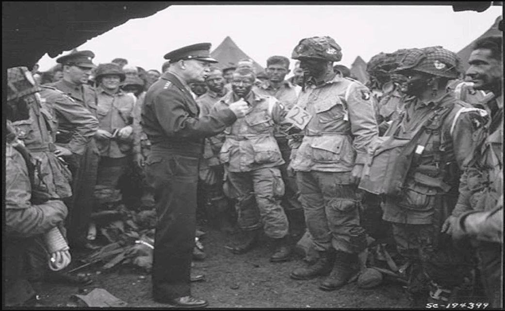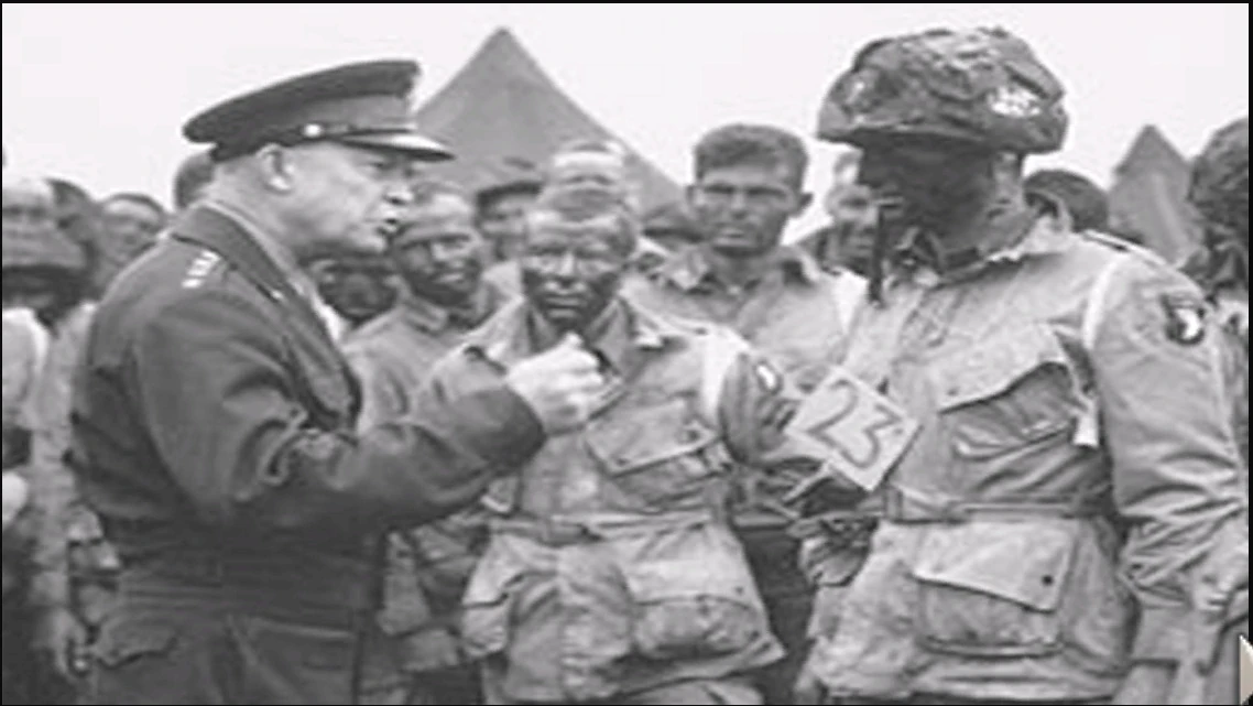 On June 5, 1944, Supreme Allied Commander, Gen. Eisenhower meets with Sgt. Baker's real-life unit - 502 Parachute Infantry Regiment, 101st Airborne.